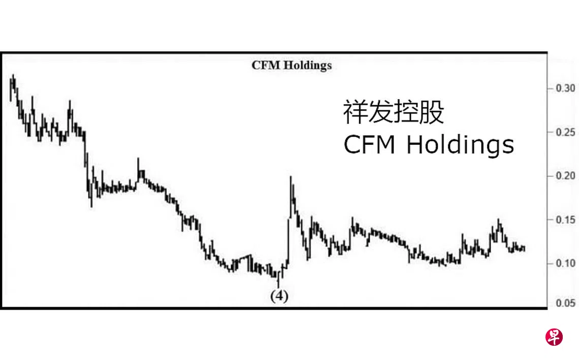 这只股票自2004年元月16日升试0.32元后,就以三大波下调。2006年8月18日股价下跌至0.043元完成了A大波,随即向上回扯至2007年4月18日的0.16元,此为B大波。2019年8月15日股价下跌至0.01元,遂于每月一杆图以“主要转向”信号结束了C大波,旋进入五波升势。2020年9月7日股价上升至0.057元完成了第(1)波,接着以一个升势“三角形”替代了第(2)波回扯;期间股价向下回扯至同年9月21日的0.024元,此为图中的第(II)点,过后回升至同年11月11日的0.049元结束了第(III)点。第(IV)点终于在2021年3月11日的0.026元完成,遂进入第(3)波升势。2021年6月11日股价上升至0.38元,由于升势特急,造成介于0.167元与0.158元及介于0.073元与0.063元间出现缺口。今年元月25日股价以三波下试0.072元,随即将上述第一个缺口填补,过后于该周每周一杆图以“转向”信号为第(4)波画下句号,旋进入第(5)波升势。短期内,股价当升逾0.20元,并将升试位于0.24元的阻力线。