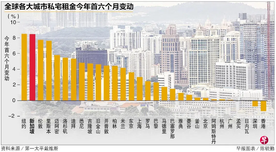 全球主要城市对优质住宅的需求飙升,但供应却受到限制,导致优质住宅过去半年的租金价值走高,资本价值也继续上升。其中新加坡和纽约上半年租金增长引领全球城市,超过8%。