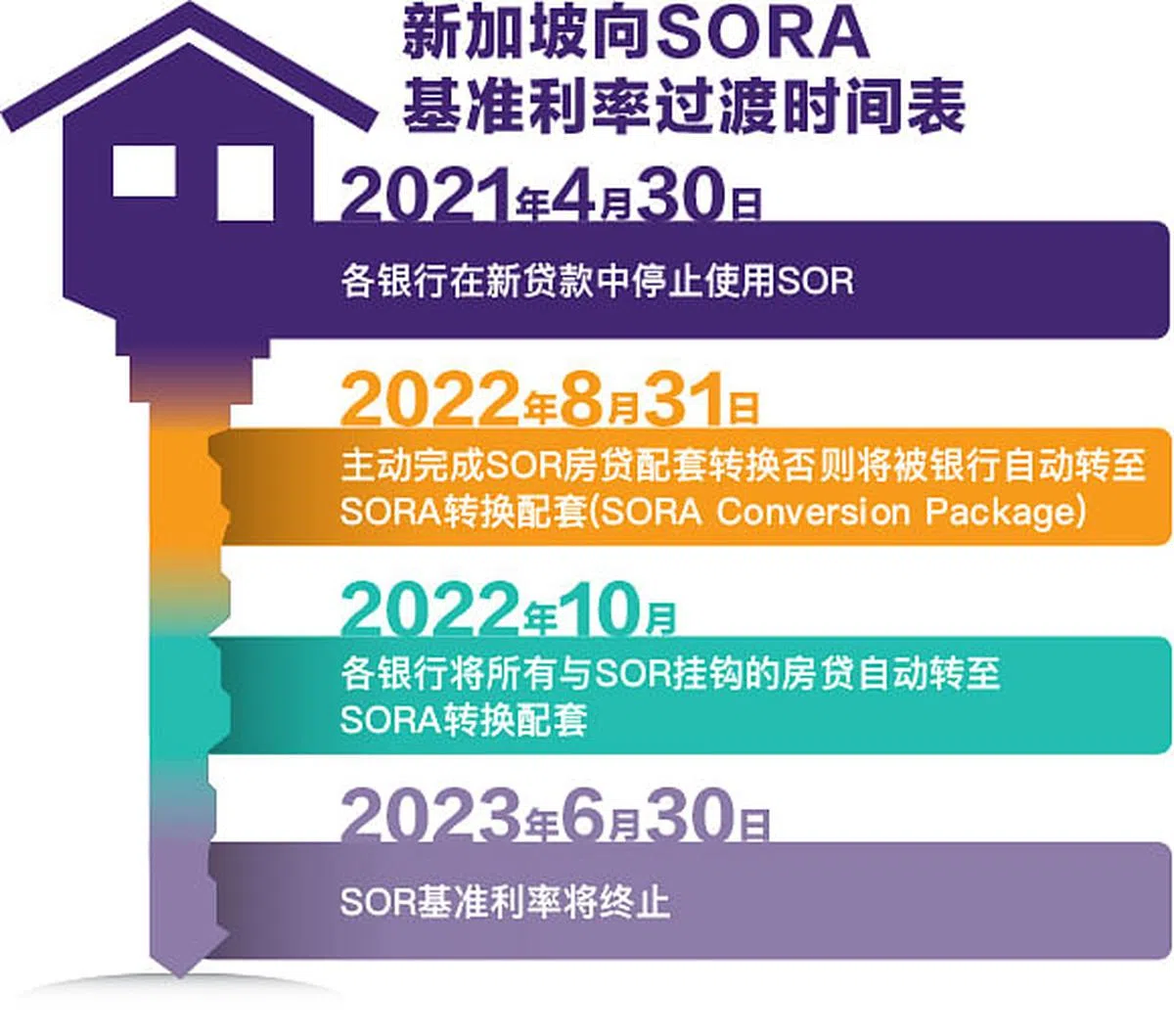 答:如果你目前的房贷以SOR为基准利率,你应立刻与银行讨论转换房贷配套,了解相关的替代配套, 以确保转换手续能在今年8月31日前完成。若你届时未主动将SOR房贷转换成其他配套,那么银行就会在今年10月自动将所有SOR房贷转换为SORA转换配套(SORA Conversion Package),由此可避免因SOR在明年6月30日终止采用而可能造成的房贷断供 。