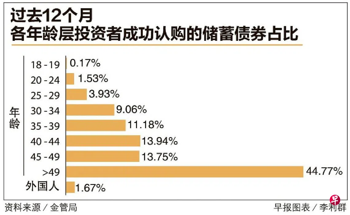 金管局提供的数据显示,过去12个月投资储蓄债券的投资者,49岁以上成功认购的债券占绝大多数,达44.8%;40岁至44岁及45岁至49岁的认购额各占约14%,35岁至39岁的占约11%。也有一小部分介于18岁至24岁的年轻人(1.7%)投资储蓄债券。