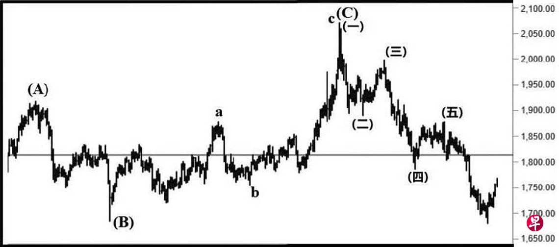 本栏于去年12月24日曾论及金价一旦跌穿位于1694.05元的“三角形”下限,当朝1460.17元的目标前进。当时金价为1803.40元左右。回顾金价于去年6月1日上升至1916.40元完成了(A)波;同年8月9日金价下跌至1684.37元,此为(B)波。因此,见报当天金价正处三波回扯中的(C)波,而此(C)波又可细分为三波。同年11月16日金价上升至1876.90元,并于当天以“主要转向”信号完成了图中的a波,过后回扯至12月15日的1753.30元,此为b波。今年3月8日金价上升至2069.89元结束了c波,同时为(C)波画下句号,旋以一个跌势“斜向交叉”缓缓回落。3月29日金价下跌至1889.45元完成了图中的第(二)点,接着回扯至4月18日的1998.10元,此为第(三)点。5月16日金价直探1786.60元结束了第(四)点,6月13日金价回扯至1877.05元,且于当天以“主要转向“信号完成第(五)点。7月21日金价终于跌穿上述位于1694.05元的价位,直试1680.25元;短期回扯,金价当试1782.53元及1814.12元的阻力线后,重返跌势。
