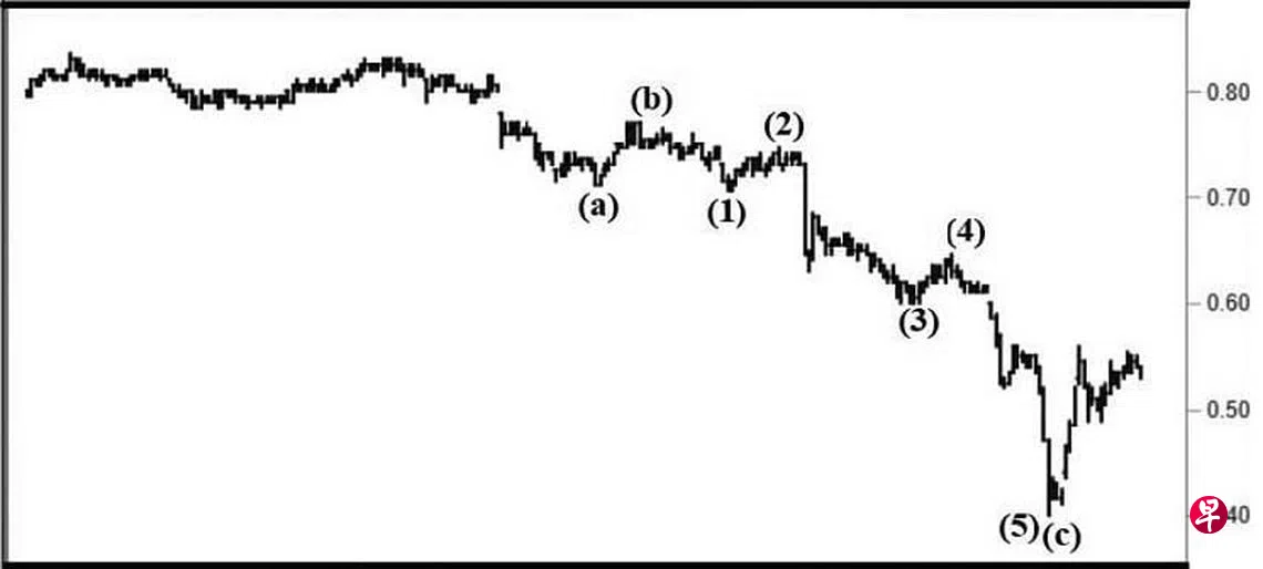 本栏于今年5月13日曾论及这只股票已经进入c波跌势,估计填补介于0.615元与0.605元间的缺口当无悬念。当时股价为0.63元左右。见报当天股价下跌至0.60元,遂将上述缺口填补;5月20日股价第四度下试0.60元未果,随即于当天以“主要转向”信号完成了一个五波跌势中的第(3)波。回顾股价自今年2月15日升试0.77元结束了(b)波,旋进入具五波跌势的(c)波。3月16日股价下探0.705元应为第(1)波,过后回扯至3月31日的0.745元完成了第(2)波。因此,6月1日股价回扯至0.645元,并以“主要转向”信号结束了第(4)波,旋进入第(5)波跌势。7月1日股价下跌至0.40元完成了第(5)波,随即止跌回升;由于跌势甚急,造成介于0.60元与0.615元及介于0.47元与0.48元间出现缺口。7月13日股价已经上升至0.56元,不但填补了上述第三个缺口,同时又在介于0.435元与0.415元间留下缺口。短期内股价将继续上升,以填补上述第二个缺口后,重返跌势,毕竟上述第四个缺口尚未被填补。