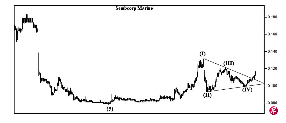 这只股票自2011年4月8日升试3.36元后,就以五波进入跌势。同年10月4日股价下探1.70元,并于其每月一杆图以“主要转向”信号完成第(1)波;过后回扯至2012年3月2日的3.04元结束了第(2)波。2016年9月2日下跌至0.68元完成了第(3)波,接着进入具三波回扯的第(4)波。2017年3月6日上升至1.17元结束了(a)波,随即下调至同年8月18日的0.87元,此为(b)波。2018年2月2日上升至1.57元完成了(c)波,同时为第(4)波画下句号。2021年11月2日下探0.078元,且于其每周一杆图以“主要转向”信号结束了第(5)波,遂止跌回升。今年4月26日股价升试0.131元后,渐渐形成一个升势“三角形”,5月6日回扯至0.093元完成了图中的第(II)点;6月9日上升至0.121元,此为第(III)点,7月15日下试0.099元结束了第(IV)点。7月29日终于穿上位于0.108元的“三角形”上限,若以其高计自上限,可测得基本目标为0.145元。