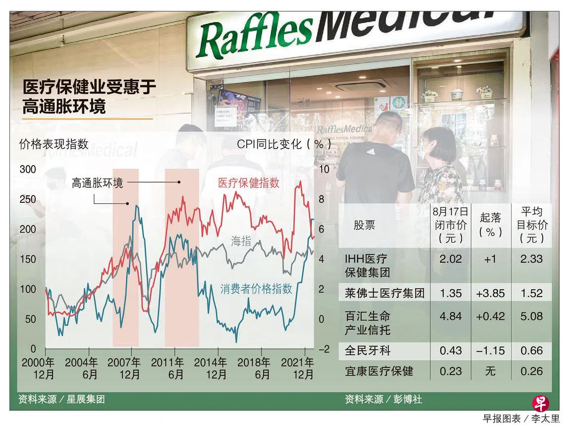 星展集团分析师陈丽睿发表报告指出,以历史走势看,2000年至2013年期间当通胀偏高时,医疗保健股指数与消费者价格指数有着一定的正数关联。医疗股在高通胀环境下的表现也跑赢新加坡海峡时报指数。