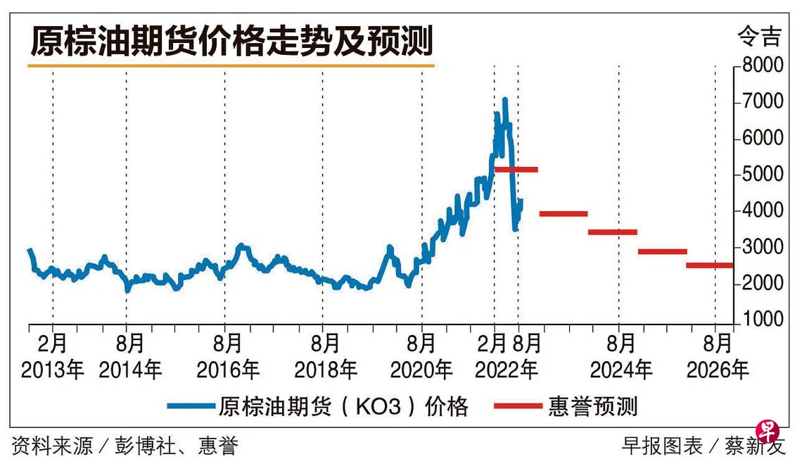 惠誉的预测,远低于市场共识(中位数)。根据彭博社,市场预测棕油价格在2022年平均每公吨6455令吉,2023年、2024年、2025年和2026年平均每公吨料分别为5900令吉、5500令吉、5300令吉和5000令吉。