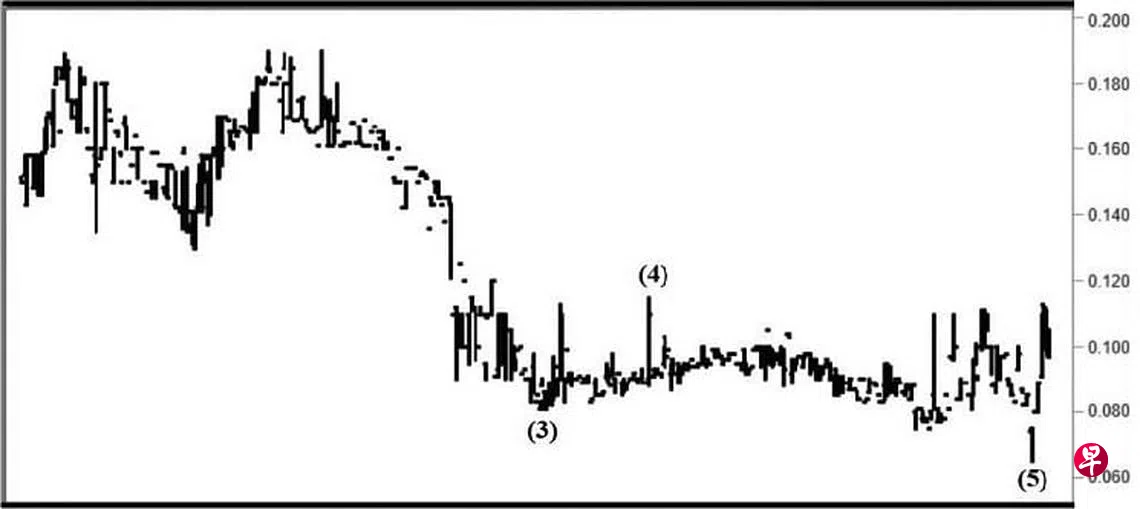 这只股票自从2008年11月18日下跌至0.045元后,并于该月每月一杆图以“转向”信号进入三波回扯。2011年7月20日股价上升至0.158元完成了A波,接着下调至2012年10月1日的0.117元,随即于当天以“主要转向”信号结束了B波,过后又于其每周一杆图以“主要转向”信号进入长达一年余的升势。2013年11月12日股价上升至0.29元,且于该月每月一杆图以“转向”信号为C波画下句号,旋进入五波跌势。2016年2月18日股价下试0.158元完成了第(1)波,过后回扯至2016年4月22日的0.22元结束了第(2)波。2020年8月17日股价下跌至0.081元,并于其每周一杆图以“主要转向”信号完成了第(3)波;接着回扯至同年12月30日的0.115元,此为第(4)波。今年7月21日股价终于下探0.065元,且于其每周一杆图以“主要转向”信号为上图中的第(5)波画下句号,遂止跌回升,截至8月15日股价已经上升至0.113元。估计升势将会持续,填补介于0.154元与0.16元及介于0.20元与0.21元的缺口也就顺理成章。