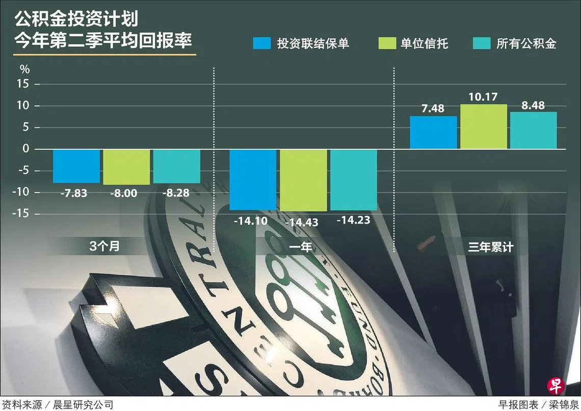 晨星研究公司发布的第二季报告说,公积金投资计划下的基金平均回报率为负8%,相较于第一季的负6.01%,表现明显逊色。这些基金包括单位信托和投资联结保单。长期来看,CPFIS基金三年期平均累计回报率为8.48%。