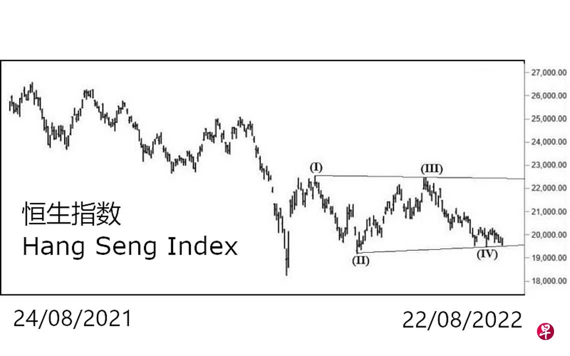 本栏于今年3月26日曾论及指数一旦填补介于23376.37点与23660.28点的缺口,当重返跌势,并向下填补介于20786.69点与20087.50点及介于18584.04点与18415.08点的缺口。当时指数为21945.95点左右。4月4日指数上升至22523.64点,且渐渐形成一个升势“三角形”的第(I)点,接着缓缓回落。4月25日指数下试19858.36点,随即将上述第二个缺口填补,过后回升至5月3日的21291.80点;无奈力不从心,旋回落至5月6日的19973.47点。由于跌势甚骤,造成介于20320.28点与20776.97点间出现缺口。5月10日指数更跳空直试19178.89点,又在介于19758.63点与20001.96点间留下缺口,同时完成了图中的第(II)点,接着以五细波渐渐回升。5月20日指数上升至20794.13点,遂将上述第四及第五个缺口填补。6月28日指数上升至22449.31点结束了第(III)点,8月10日指数下试19469.11点完成了图中的第(IV)点。估计指数短期内将向上填补介于21470.77点与21725.78点间的缺口,最终当填补上述第一个缺口,过后重返跌势;毕竟上述第三个缺口如今尚未填补。