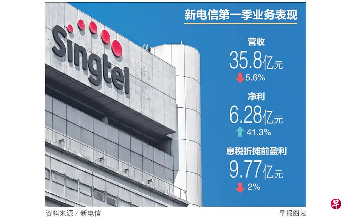 新电信(Singtel)截至今年6月底的第一季净利同比上扬41.3%至6亿2800万元,营收则下跌5.6%至35亿8400万元。