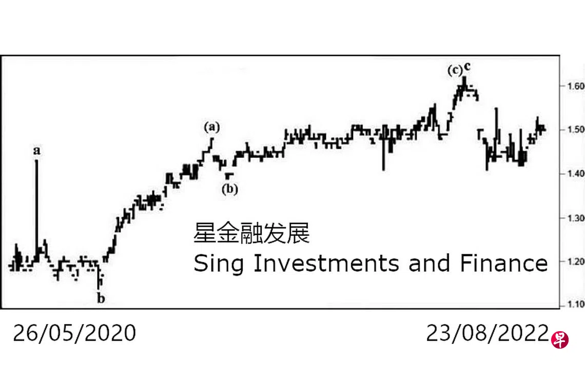本栏于2021年4月16日曾论及这只股票于去年7月1日股价回升至1.43元,此为图中a波,过后下调至同年10月27日的1.14元完成了b波。因此,估计股价目前正处c波升势,当尝试填补介于1.51元与1.56元的缺口,以完成第(4)波后,重返跌势。当时股价为1.42元左右,而此c波又可细分为三波。4月27日股价上升至1.48元完成了(a)细波,过后于次日再试此价位未果,遂于29日下跌至1.43元,同时在介于1.44元与1.48元间留下缺口。5月14日股价骤然下跌至1.39元结束了图中的(b)细波,同时又在介于1.40元与1.43元间留下缺口。5月28日股价上升至1.44元,遂将上述第三个缺口填补。7月29日股价上升至1.50元,又将上述第二个缺口填补。今年4月8日股价上升至1.62元,11日股价再试此价位未果,随即以“转向”信号完成了(c)细波,同时为c波画下句号,旋出现调整。截至5月10日股价已经下试1.41元,短期回扯股价当填补介于1.55元与1.58元的缺口;过后向下填补介于1.35元与1.32元的缺口。