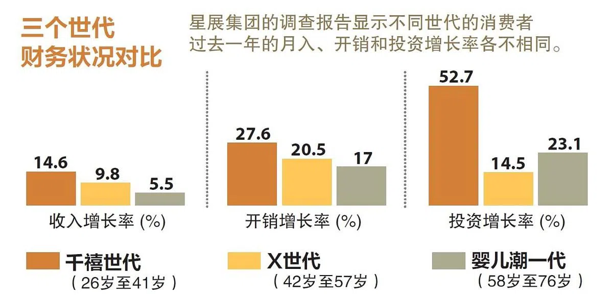星展集团的调查发现,虽然各个年龄层国人的每月开销都增加了,千禧世代(26岁至41岁)比其他年龄层国人的花费更多。千禧世代的开销增加27.6%,婴儿潮一代和X世代的开销则分别增加17%及20.5%。