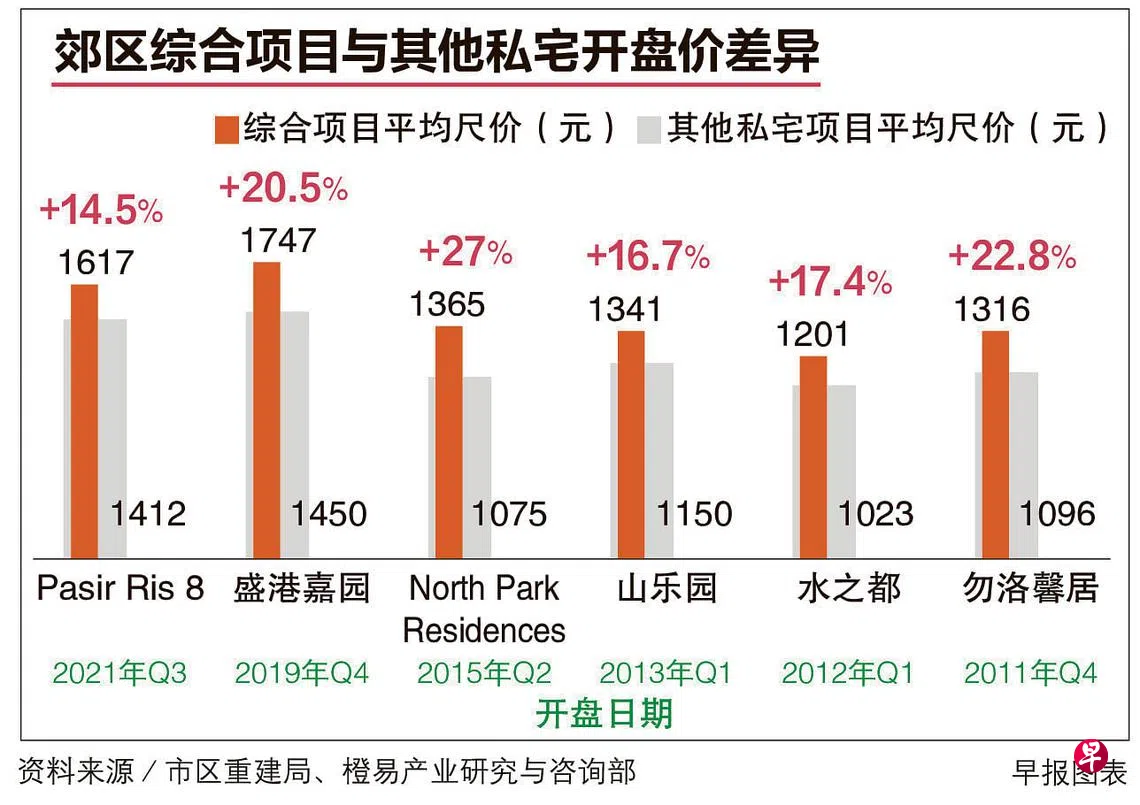 报告说,六个郊区综合项目私宅部分的开盘售价都高于区内的一般新私宅价格。以2021年推出的Pasir Ris 8为例,开盘平均价为每平方英尺1617元,比区内其他同时期推出的新私宅高出14.5%。