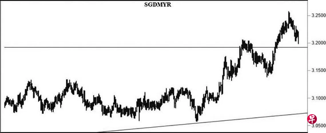 新元自2010年4月9日下跌至1新元兑2.2830令吉后就以三大波向上回扯,其间A大波又具三波。2012年7月26日新元上升至2.5376令吉完成了(A)波,随即回落至2013年5月23日的2.3798令吉,同时于当天以“主要转向”信号结束了(B)波,接着进入具五波的(C)波。2014年2月11日新元上升至2.6328令吉完成了第(1)波;过后下调至同年8月28日的2.5162令吉,此为第(2)波。2015年9月28日新元上升至3.1281令吉结束了第(3)波。2017年2月28日新元升试3.1754令吉结束了第(5)波,同时为A大波画下句号。2018年5月10日新元回扯至2.9257令吉,并于当天以“主要转向”信号为B大波画下句号,旋进入具五波的C大波升势。2019年12月13日新元升试3.0761令吉,且于当天以“主要转向”信号完成了第(I)波,接着回扯至2020年3月27日的2.9665令吉,此为第(II)波。截至今年8月10日,新元已上升至3.2568令吉,短期回扯或将下试3.1921令吉的支撑线后,重返升势,最终当突破位于3.3361令吉的阻力线。