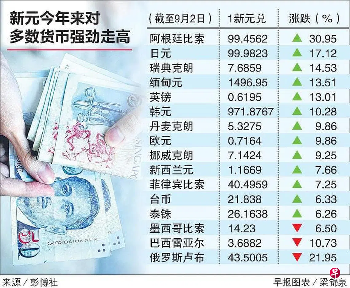 今年以来,新元兑世界逾六成货币上涨,当中的四成涨幅更达到10%或以上,包括日本和欧洲等热门旅游目的地和主要贸易伙伴。分析师指出,新元强劲刺激国人外出旅行,我国从日本的进口也更多,对商家的影响则不一。