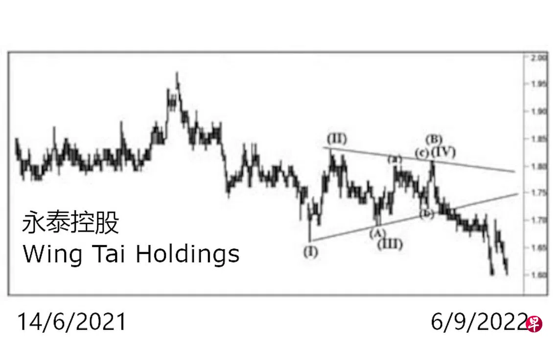 本栏于今年5月24日曾论及这只股票今年3月8日一度下探1.66元,估计跌穿1.63元的支撑线将是指日可待了,当时股价为1.74元左右。5月27日股价上升至1.80元完成了图中的(a)波,接着缓缓回落至6月24日的1.72元,旋于当天以“主要转向”信号结束了(b)波。6月29日股价上升至1.81元,并于当天以“主要转向”信号完成了图中的(c)波。同时为(B)波画下句号,随即渐渐下滑。8月23日股价终于跌穿上述位于1.63元的支撑点,直试1.60元。8月26日股价一度跳空上升至1.70元,造成介于1.65元与1.61元间出现缺口。9月6日股价回落至1.60元,遂将上述缺口填补。回顾股价自今年3月8日下试1.66元的价位后,就渐渐形成一个跌势“三角形”。3月5日股价上升自1.83元完成了图中的第(II)点,5月10日股价下调自1.69元,此为第(III)点,6月29日股价升试1.81元结束了第(IV)点。若以“三角形”的高,计自1.71元的下限,可测得基本目标为1.55元了。