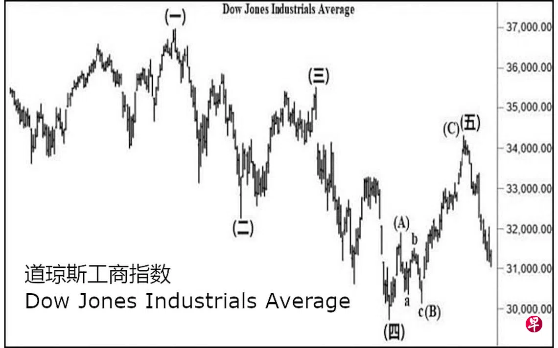 本栏于今年7月2日曾论及指数即将重返跌势,填补介于28902.13点与28323.40点的缺口当指日可待。当时指数为30775.43点左右。7月5日指数一度下跌至30355.12点,旋于当天以“转向”信号完成了图中的a波,接着回扯至8日的31511.46点,此为b波。7月14日指数骤然下试30143.93点结束了图中的c波,同时为(B)波画下句号,由于跌势甚急,造成介于30680.12点与30772.79点间出现缺口;15日指数跳空上升至31288.26点,随即将此缺口填补,同时又在介于30775.37点与30630.17点间留下缺口。回顾指数与今年6月22日上升至31885.09点,并于当天以“主要转向”信号完成了三波回扯中的(A)波。因此,指数自7月中就进入(C)波升势。8月16日指数升试34281.36点,且于该月底以31510.43点闭市,遂于每月一杆图以“转向”信号为图中的第(五)点画下句号。纵观指数自今年元月5日的36952,65点下跌以来,一个大型的跌势“斜向交叉”已经形成,若以图中的第(三)点及第(四)点价差,计自第(五)点,可测得基本目标为28529.49点。