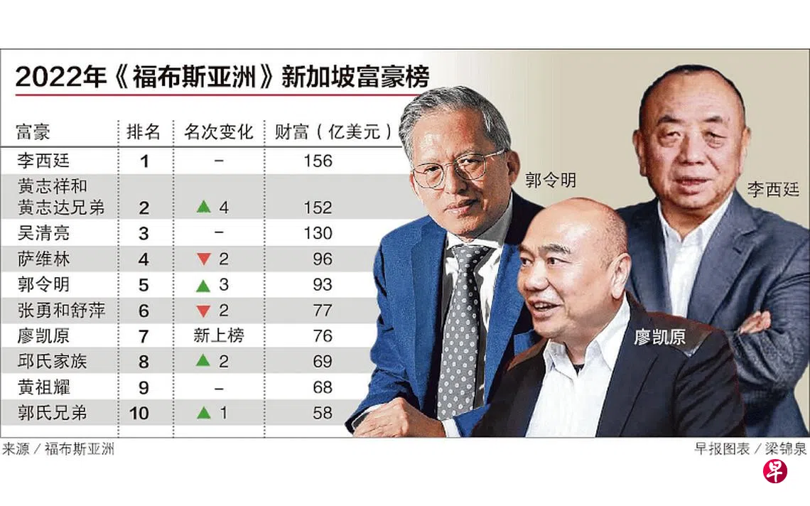 深圳迈瑞医疗创始人兼董事长李西廷在《福布斯亚洲》2022年新加坡50大富豪榜上蝉联榜首,远东机构黄志祥黄志达兄弟身家增加7%至152亿美元,排名跃至第二,城市发展执行主席郭令明财富增加9.4%至93亿美元,排名跳三级至第五。