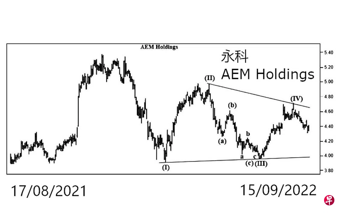 本栏于今年5月27日曾论及这只股票填补介于4.16元与4.11元的缺口当无悬念,而穿下3.86元的支撑点也就水到渠成。当时股价为4.28元左右,股价过后渐渐回升,5月30日一度升试4.47元,由于升势甚急,造成介于4.37元与4.34元间出现缺口。6月3日股价上升至4.61元完成图中的(b)波;因此,5月25日股价下试4.26元,应为三波调整中的(a)波。6月13日股价骤然下跌至4.20元,随即将上述第二个缺口填补。6月20日股价下试4.02元结束了图中的a波,过后回扯至6月27日的4.24元完成了b波;由于回扯甚急,造成介于4.05元与4.08元及介于4.12元与4.15元出现缺口。7月12日股价下跌至4.00元,旋将上述第三及第四个缺口填补。7月14日股价终于下探3.96元结束了图中跌势“三角形”的第(III)点。8月15日股价骤然上升至4.69元,造成介于4.55元与4.38元间出现缺口。8月26日股价已经上升至4.71元,此为第(IV)点。估计股价已经进入跌势,一旦跌穿位于3.98元的下限,股价当试3.87元的支撑线了。