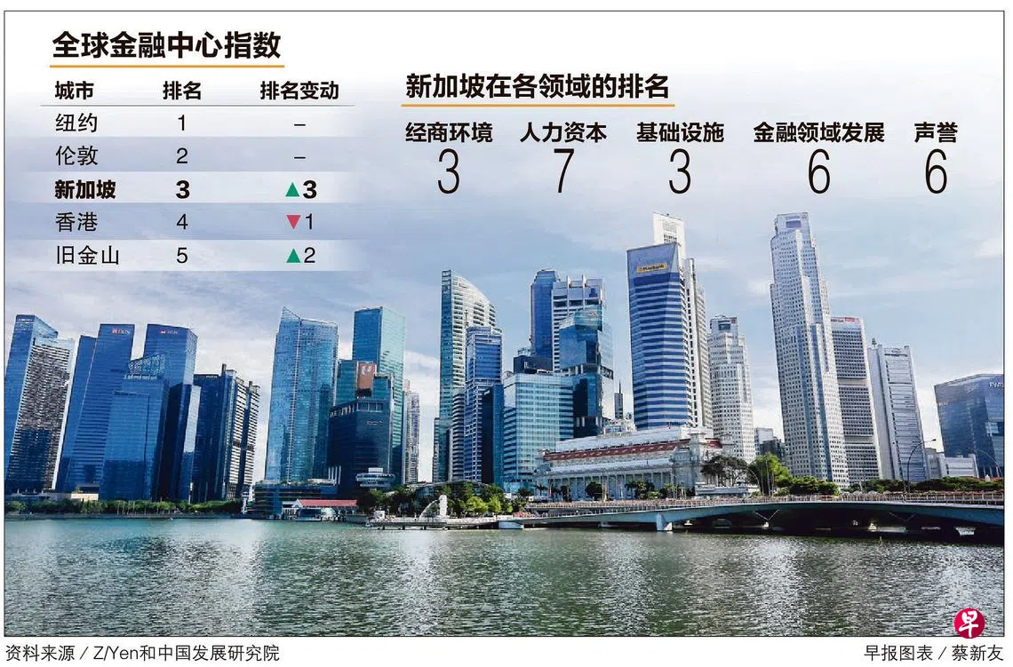 “全球金融中心指数”模型涵盖经商环境、人力资本、基础设施、金融领域发展和声誉五个竞争力因素,新加坡的排名分别为第三、第七、第三、第六和第六。