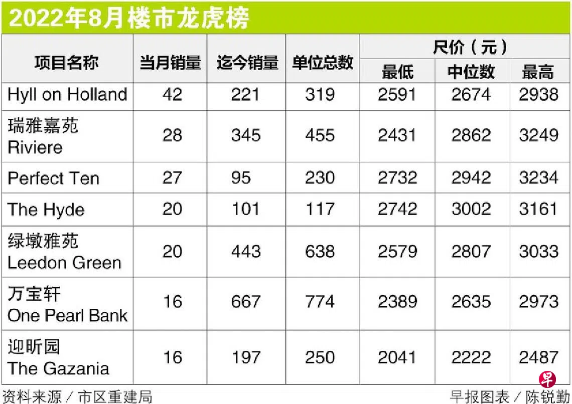 其中,销量居榜首的是位于荷兰路的Hyll on Holland,在8月共售出42个单位。这是由远东发展(Far East Consortium International)和许兄弟发展(Koh Brothers Development)合资发展的永久地契项目,共319个单位,预料在2025年竣工。
