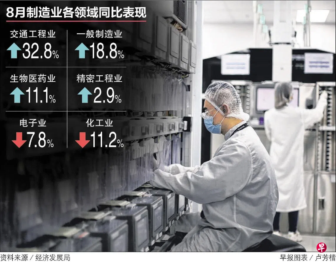 生物医药业需求上扬,扶持我国制造业产值连续11个月扩张,在8月同比增长0.5%,优于市场预期。不过经济师指出,比重最大的电子业连续两个月同比萎缩,预示着制造业在未来几个月可能陷入萎缩,我国经济面临技术性衰退的风险。