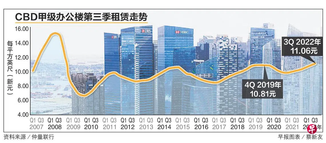 尽管面对经济不稳定,在商业活动恢复的支持下,中央商业区的甲级办公楼租金在第三季创下新高,每平方英尺的每月租金平均达11.06元,空置率也偏低。