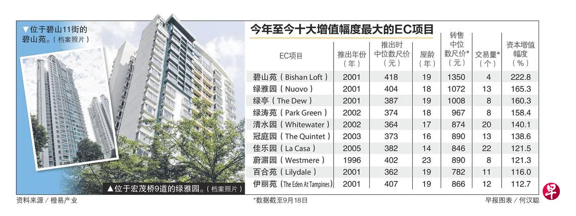 满10年后私有化的执行共管公寓(EC)的升值空间大,这些升级为私宅的EC,转售中位数尺价较开盘时增加至少80%,有的在转手时甚至增值逾200%。