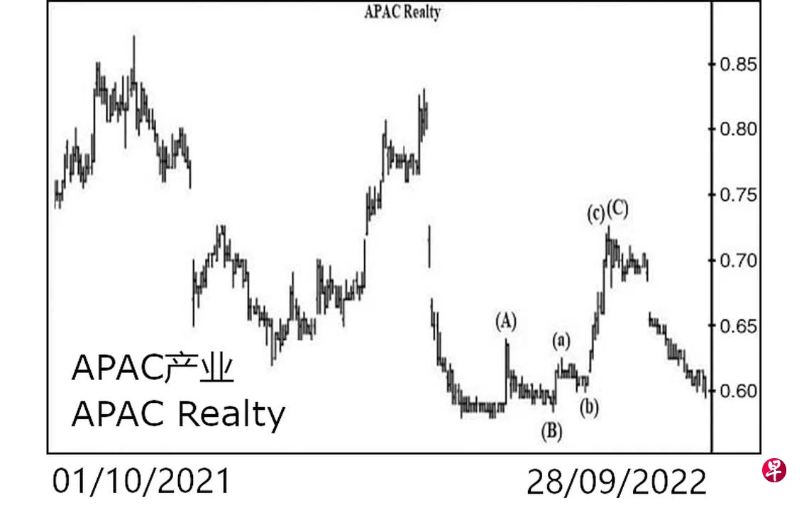 本栏于今年5月12日曾论及这只股票截至5月10日已经下跌至0.60元。估计短期回扯,股价当向上填补介于0.67元与0.71元及介于0.725元与0.805元留下的缺口后,重返跌势。当时股价为0.61元左右。股价过后并没有立即回扯,而是继续下滑。5月18日下试0.58元,才于当天以“转向”信号止跌回升。6月10日股价骤升至0.64元,完成了图中的(A)波,接着缓缓回落至7月6日的0.585元,此为(B)波,随后进入具三波的(C)波。7月12日上升至0.625元结束了(a)波,过后回落至7月25日的0.60元完成了(b)波。7月28日骤然上升至0.65元,又在介于0.625元与0.62元间留下缺口。8月3日股价更升试0.70元,几乎将上述第一个缺口全予填补。8月5日终于升试0.725元,随即于当天以“转向”信号结束了(c)波,同时也为(C)波画下句号,旋迅速回落,截至9月28日股价已经下试0.595元,同时在介于0.66元与0.69元间留下缺口。短期回扯,当填补此缺口,过后重返跌势。