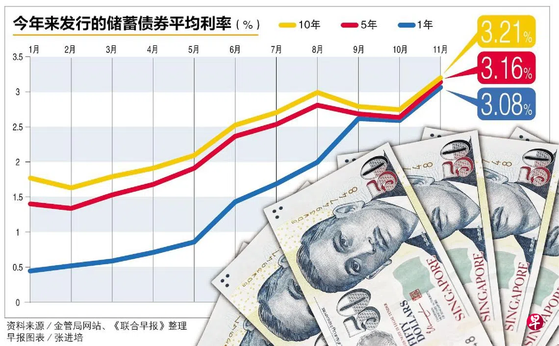 新加坡金融管理局星期一(10月3日)公布新一批储蓄债券利率,首年利率为3.08%,10年平均利率更是达3.21%,高于市面上不少银行存款利率。