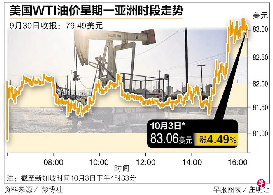 (新加坡综合讯)油价星期一(10月3日)在亚洲一度跳涨超过3%,因为石油输出国组织与俄罗斯等盟友(油盟+)考虑把日产量削减超过100万桶,这是冠病疫情暴发以来的最大减产,以支持石油市场。