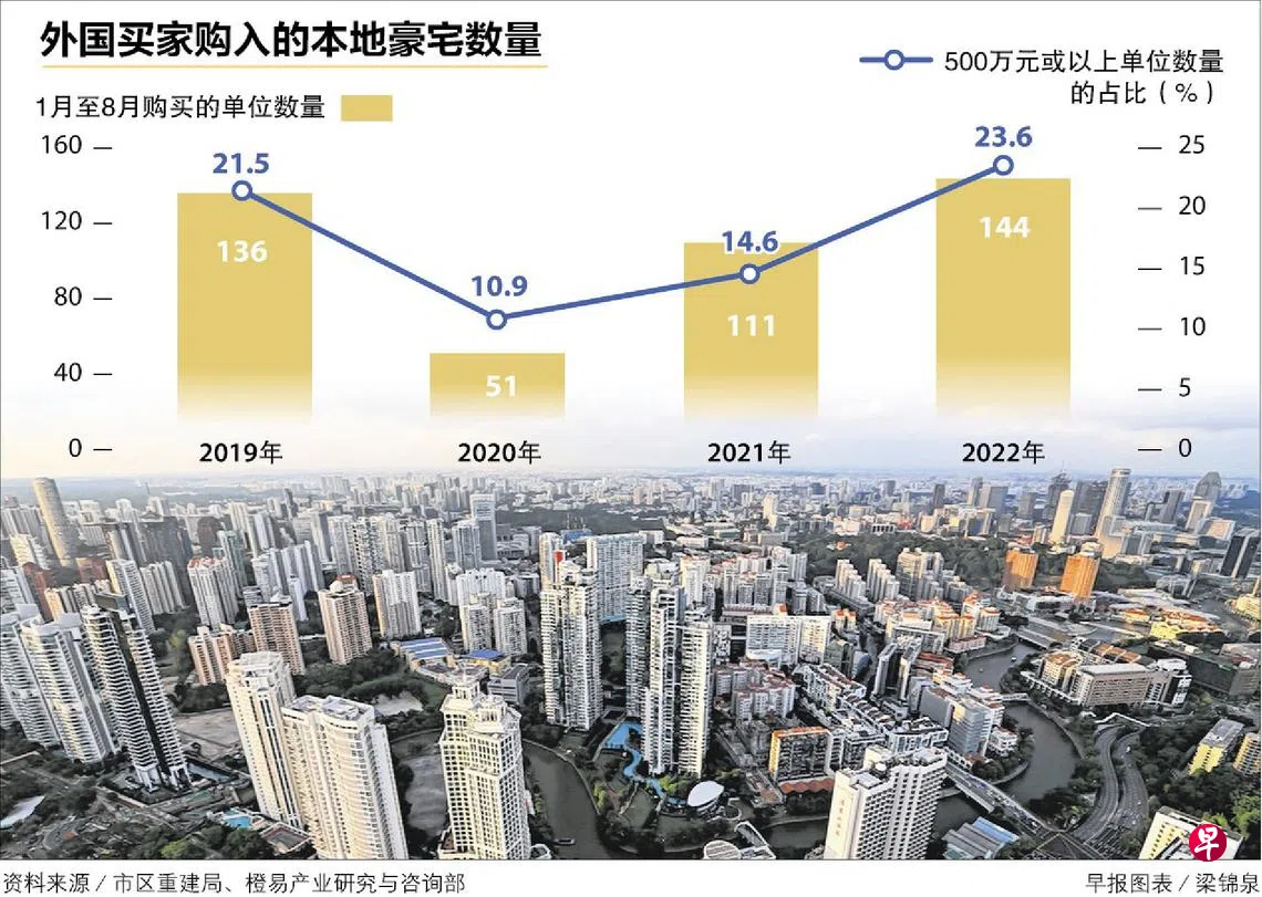 橙易产业(Orangetee & Tie)研究与咨询部提供给《联合早报》的最新数据显示,根据市区重建局Realis网站,非新加坡永久居民的外籍人士,在今年1月至8月间购买了144个价格在500万元或以上的非有地私宅,比2020年和2019年同期分别多出182.4%和5.9%。