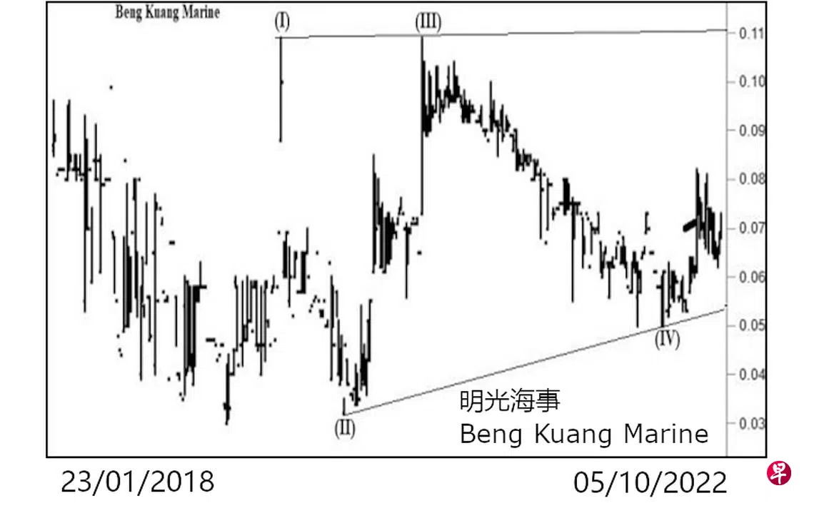 本栏于去年12月1日曾论及这只股票当向下填补0.073元与0.065元的缺口,以完成升势“三角形”的第(IV)点后,重返升势,并将朝0.19元的基本目标前进。当时股价为0.092元左右,见报当天股价下试0.085元,今年元月18日骤然下探0.068元,旋将上述第一个缺口的大部分填补,21日回升至0.081元,遂在介于0.081元于0.078元间留下缺口;元月25日股价回落至0.067元,同时又在介于0.067元与0.081元间留下缺口;幸好股价于元月26日回升至0.08元,几乎将此缺口全予填补。2月24日股价骤跌至0.055元,填补了介于0.063元与0.056元间的缺口,5月23日更下试0.05元。7月15日再试此价位,18日第三度试此价位未果。旋于当天以“主要转向”信号完成了上述的第(IV)点,遂进入升势,截至9月15日股价已经上升至0.082元。估计升势将会持续,向上突破位于0.109元的“三角形”上限,势必带领股价填补介于0.125元与0.133元间的缺口后,朝上述0.19元的基本目标前进。