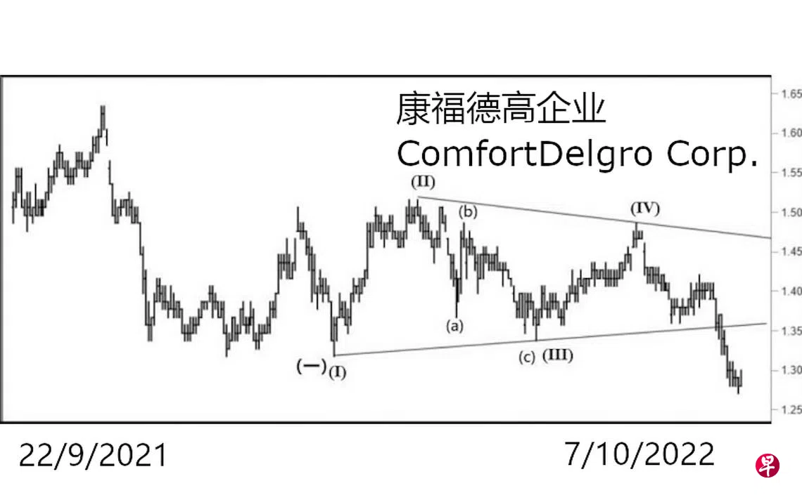 本栏于今年4月29日曾论及这只股票当时正处具三波的第(二)波回扯,并可能填补介于1.58元与1.61元间的缺口以完成第(二)波后,重返跌势。当时股价为1.47元左右。实际上,第(3)波中的第(一)波应是在今年3月8日的1.32元结束,而上述的第(二)波回扯,却在回扯中,渐渐的被一个跌势“三角形”替代。回顾股价于3月8日下试1.32元后,遂于当天以“转向”信号止跌回升。4月20日股价上升至1.52元为图中的第(II)点画下句号。5月12日股价下试1.37元完成了(a)波,接着回扯至5月18日的1.49元,此为(b)波。6月23日股价下探1.34元结束了(c)波,同时为第(III)点画下句号,过后持续上升。8月16日股价升试1.49元完成了第(IV)点,旋进入跌势。9月26日股价终于跌穿位于1.36元的“三角形”下限,接着迅速滑落。截至10月6日股价已经下试1.27元,短期回扯,当止于1.36元,若以“三角形”的高,计自其下限,可测得基本目标为1.17元。