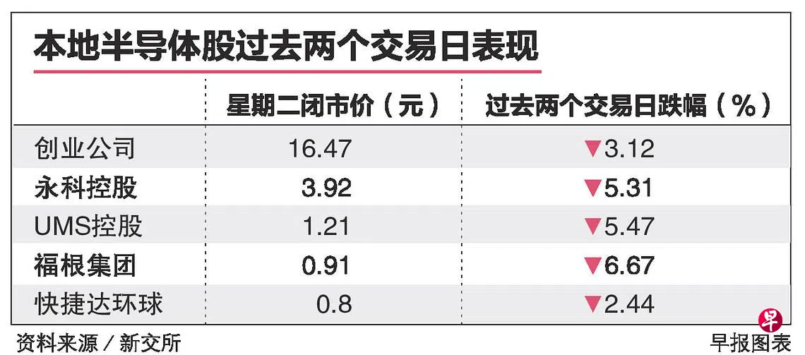 美国对中国实施新一轮出口管制措施打击全球半导体行业的前景,造成各地半导体股面对抛售压力。五只本地半导体股皆下挫,过去两个交易日跌幅最高6.67%。