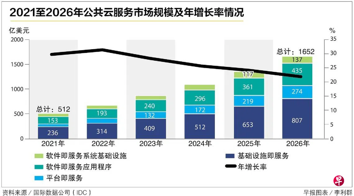 国际数据公司(IDC)在近期发布的一份报告中预测,随着云迁移持续加速,亚太地区云服务的市场规模在2022年的年增长率将达到31.4%,2021年为30%。不过从2023年开始,年增长率将放缓,从28.3%降至2026年的22.4%。