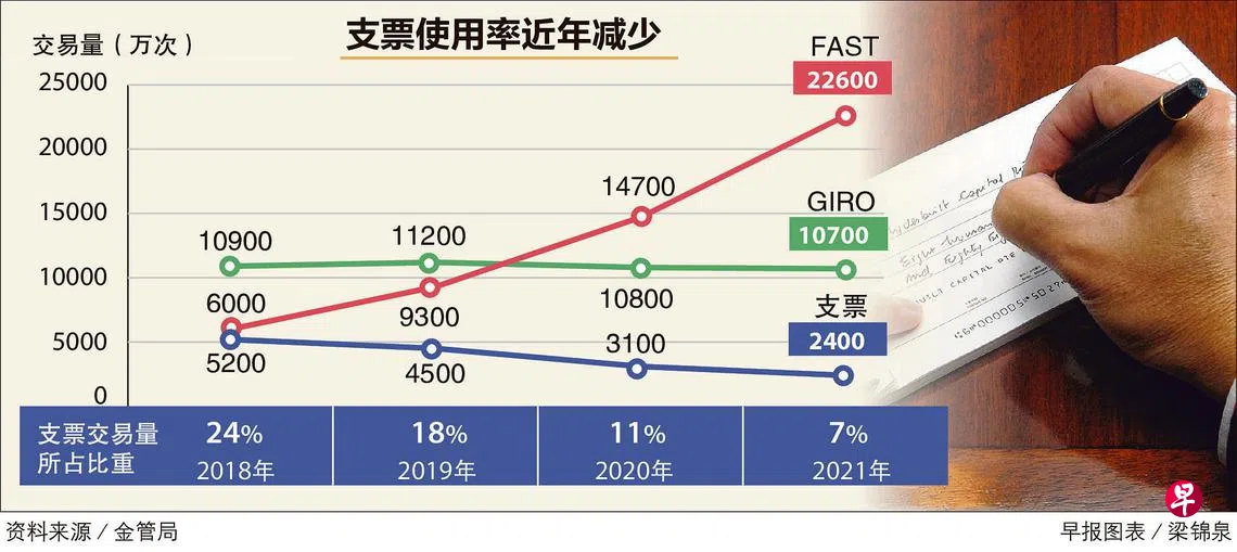 新加坡金融管理局发布的半年零售支付数据显示,支票、即时付款清算网络FAST,以及财路(GIRO)三大付款方式的合计交易量当中,支票所占的比重过去几年不断下跌,去年为7%,比2018年少了17个百分点,今年上半年进一步跌至5%。