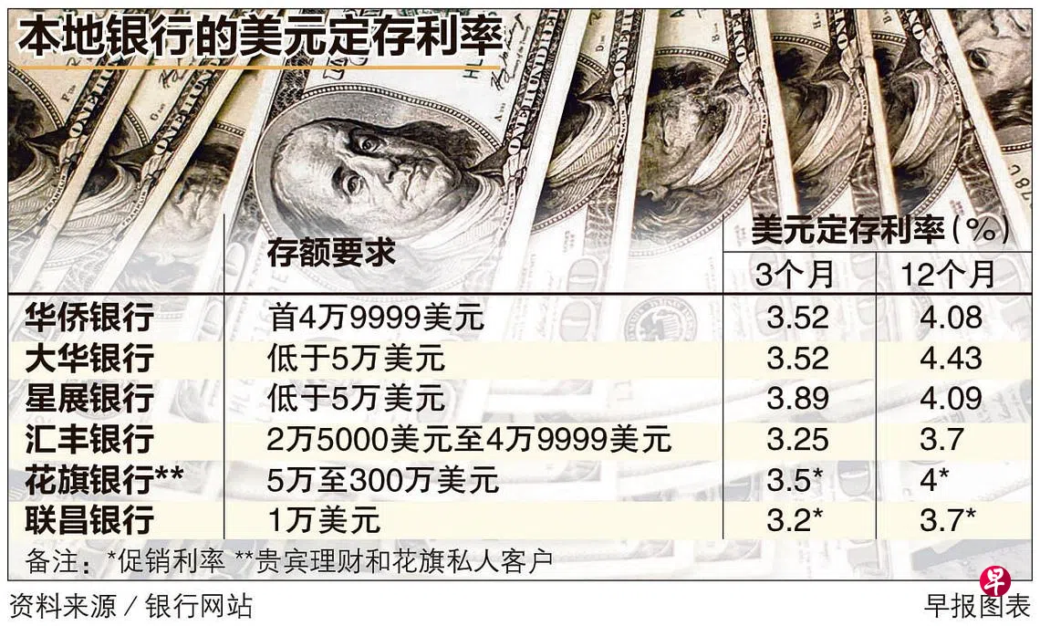 较长期的定存配套方面,汇丰银行(新加坡)和联昌银行(CIMB)本月初也调高了美元定存利率,汇丰银行的12个月定存利率上调至3.9%。联昌银行的12个月定存利率从3.5%调高至3.7%。
