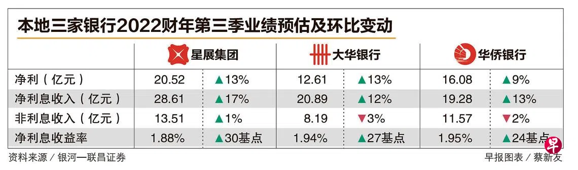 分析师预计,本地三家银行2022年第三季净利息收益率(NIM)上升24至30基点,这将抵消收费收入疲弱和信贷成本趋向正常,此外,美国联邦储备局多轮加息推升NIM,料将体现在本地银行第三季业绩中。
