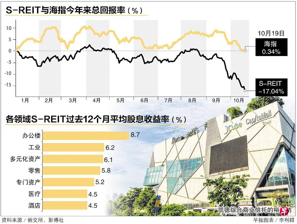 截至10月19日,追踪36只S-REIT表现的iEdge新加坡房地产投资信托指数今年来的总回报率为负17.04%,而反映30只本地蓝筹股走势的新加坡海峡时报指数为0.34%。