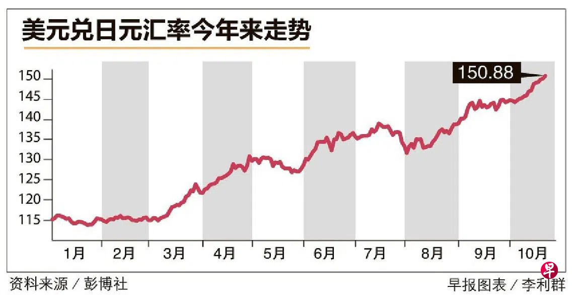 美元进一步走强,日元星期五(10月21日)下滑0.2%,一度报1美元兑150.88日元。新元兑日元汇率则一度达105.58,日元贬值近20%。