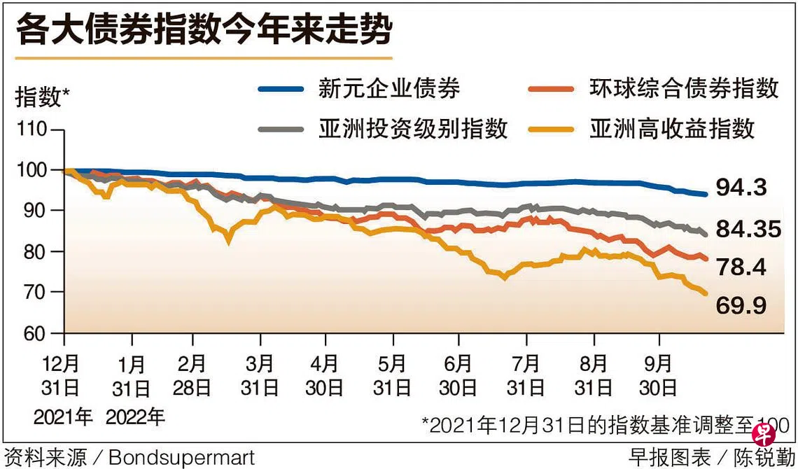 根据Bondsupermart环球固定收益研究部提供给《联合早报》的数据,同去年底比较,衡量债券表现的新元企业指数下跌5.7%;环球综合债券指数下跌21.58%;亚洲投资级别指数和亚洲高收益指数则分别滑落15.64%和30.11%。