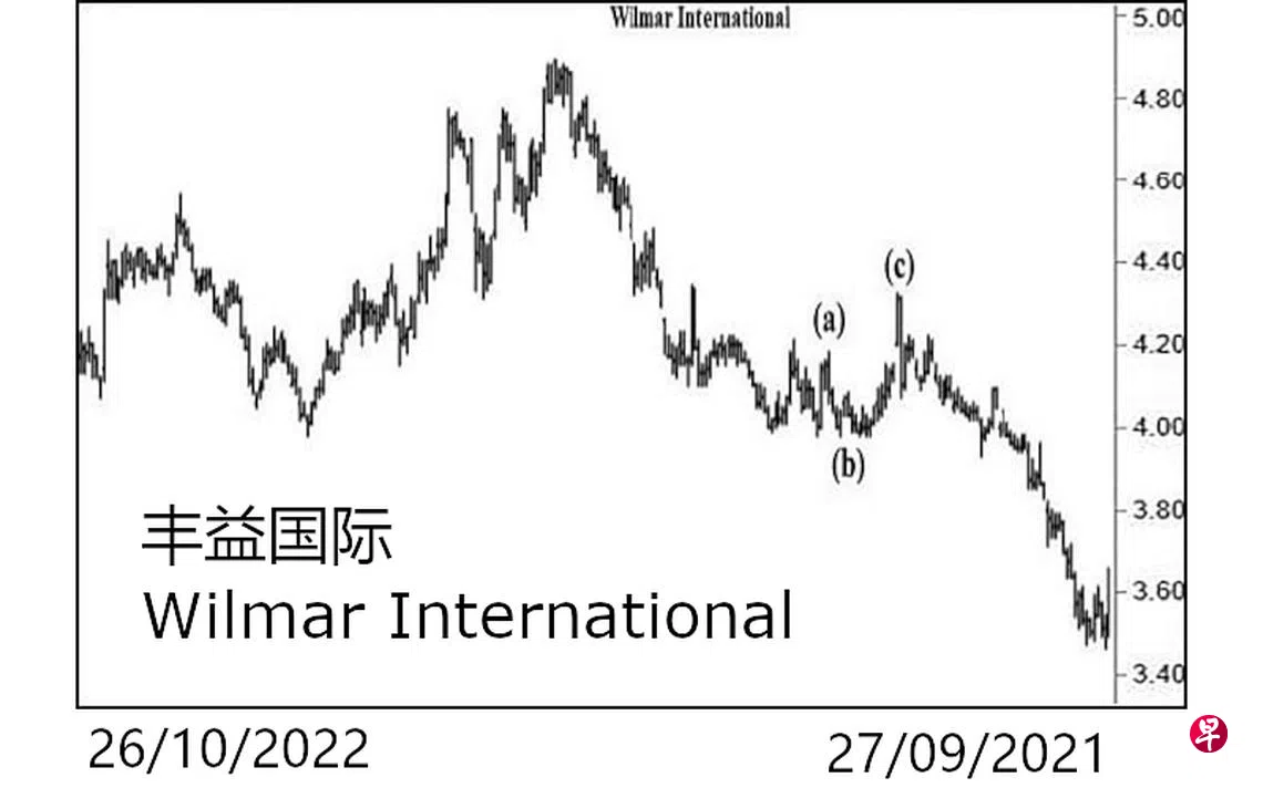 本栏于今年6月24日曾论及这只股票由于每月一杆图中的“动力”信号已经下滑至0.07860处,随时会穿下“中性线”而进入负号界域,迄时当带领股价下试位于3.83元的支撑线了。当时股价为4.02元左右,7月6日股价下跌至的3.98元,接着以三波向上回扯。7月12日上升至4.18元,遂于当天以“主要转向”信号完成了图中的(a)波,接着下跌至7月15日的3.98元,并于当天以“转向“信号结束了(b)波,旋进入(c)波升势。8月5日股价跳空升试4.32元,造成介于4.20元与4.13元间留下缺口;8日下跌至4.07元,旋将此缺口填补。8月18日再度升试4.22元未果,遂于当天以”转向“信号渐渐下滑。10月3日终于跌穿上述位于3.83元的支撑线,截至10月25日,股价已经下滑至3.46元了。回顾股价于2015年9月29日下试2.43元完成了A大波,而B大波已于2021年2月19日的5.57元的价位上结束了,估计股价目前正处C大波中的第(3)波,跌穿位于2.80元的支撑点,将是指日可待了。