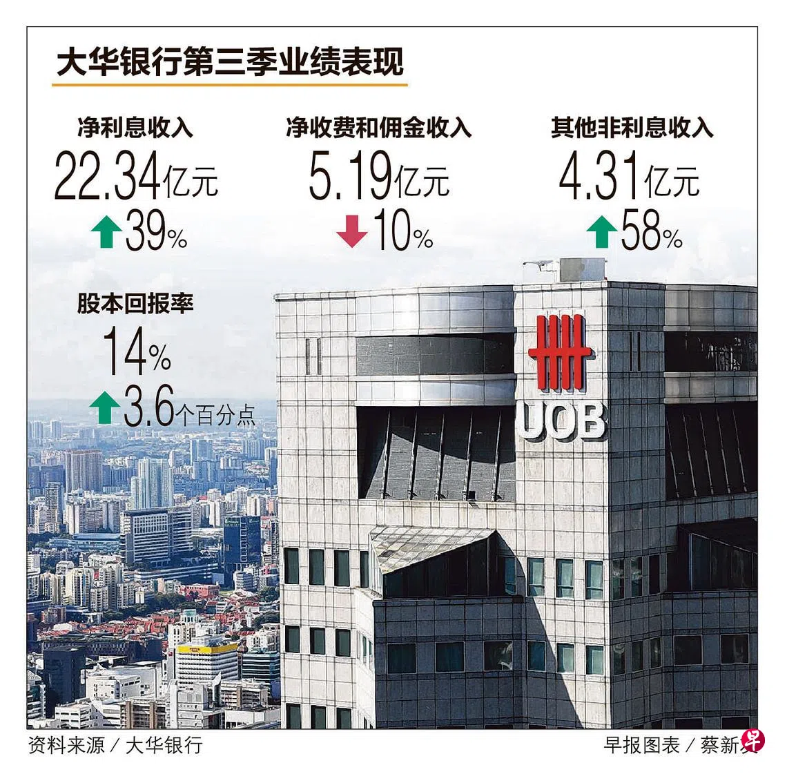强劲的净利息收入带动大华银行(UOB)第三季净利同比增长34%至14亿元,创历来最高季度记录,今年首九个月的净利达34亿元,增加12%。在利率维持上升的环境中,集团预期接下来的净利息收入都能得到良好支撑。