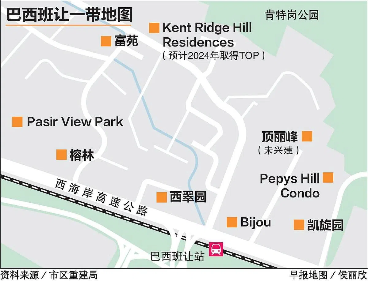 巴西班让一带集聚不少私宅,靠近顶丽峰的其他私宅包括了Bijou、Pepys Hill Condo,以及凯旋园(The Cassandra)。这一带的转售市场相当淡静,其中,Bijou项目过去一年有五个单位转售,平均尺价为2067元。