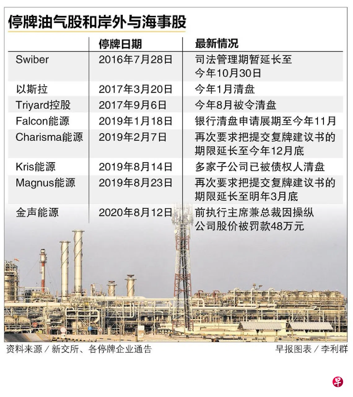 目前停牌的油气及海事与岸外企业(简称油气股)包括Swiber、Triyard控股、Falcon能源(Falcon Energy)、Charisma能源(Charisma Energy)、以斯拉(Ezra)、Kris能源(KrisEnergy)、Magnus能源(Magnus Energy)和金声能源(KS Energy)。