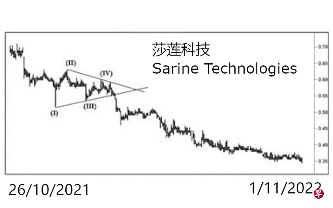 本栏于去年9月9日曾论及这只股票或将突破位于0.86元的“三角形”上限后,朝1.06元的基本目标前进。当时股价为0.72元左右。可惜股价并没有向上突破位于0.86元的价位;相反的,同年12月22日股价下跌至0.52元,完成了一个跌势“三角形”中的第(I)点,今年元月5日股价回扯至0.63元,并于当天以“主要转向”信号结束了第(II)点。元月27日股价回落至0.54元,此为左图中的第(III)点,过后回扯至2月17日的0.60元完成了第(IV)点。3月7月股价终于跌穿位于0.55元的“三角形”下限,朝位于0.44元的“三角形”目标前进,截至11月1日股价不但完成此目标,更下跌至0.345元。由于股价自2014年10月1日升试3.19元后,就进入五波跌势,期间第(4)波已经在2021年8月6日的0.84元完成,因此,股价目前正处第(5)波跌势,短期回扯,或将尝试填补介于0.43元与0.44元间的缺口,过后重返跌势,且当跌穿0.16元的价位后才可能为第(5)波画下句号。