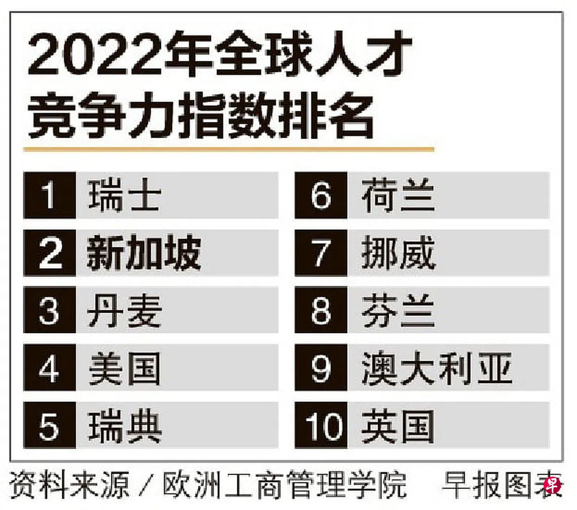 新加坡非常注重吸引和培养人才,在今年全球人才竞争力指数排行榜连续两年位居第二,排在瑞士之后。