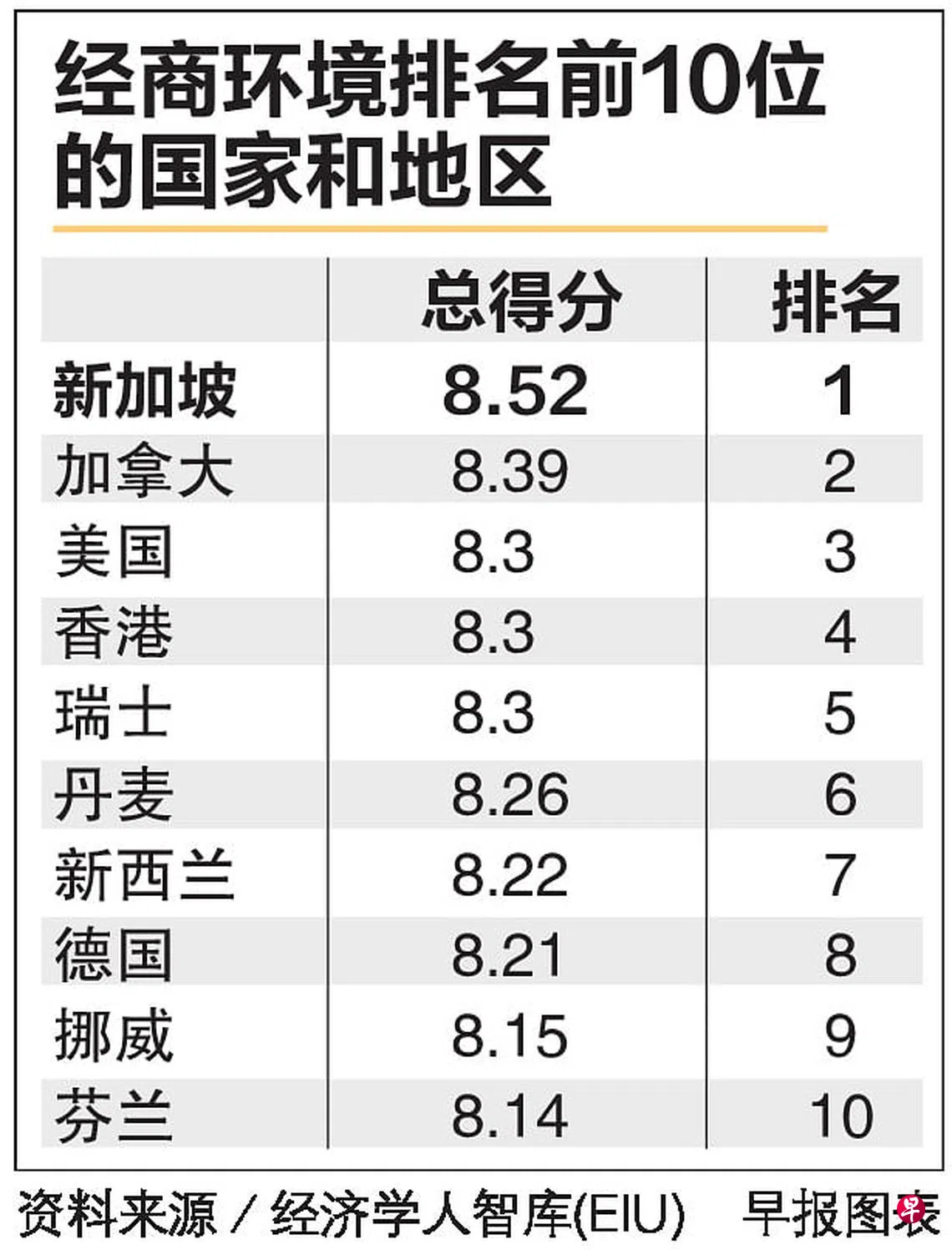 经济学人智库(EIU)发布最新的经商环境排名,新加坡在82个国家和地区中排名第一,未来五年仍将继续是全球经商环境最佳的国家。