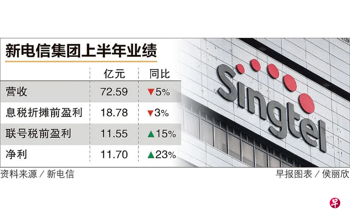 获得一次过的净特殊收益提振,新电信(Singtel)截至9月底的半年净利同比增长23%至11亿7000万元。它宣布将派发每股4.6分的中期股息和分两次派发总计每股5分的特别股息。