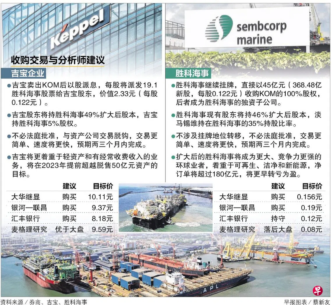 吉宝企业(Keppel Corp)和胜科海事(Sembcorp Marine)上月底宣布修订后者与吉宝岸外与海事(Keppel O&M,简称KOM)的合并协议。新协议能否获得双方股东更大的支持,是市场接下来的关注点。分析师认为,股东在考量时可从交易若不获通过会有什么后续发展,做逆向思考。